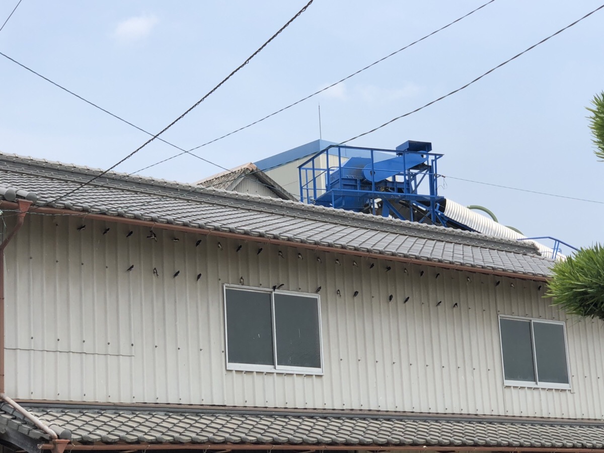 倉庫の壁に 黒い物体が点々と…..